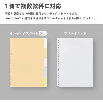 科目や項目を分けられるインデックスシート5山+未使用のルーズリーフなどを入れられるフリーポケット1枚が付属しています。