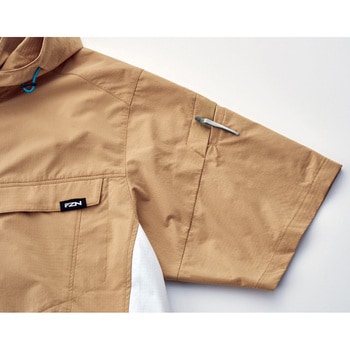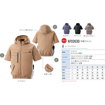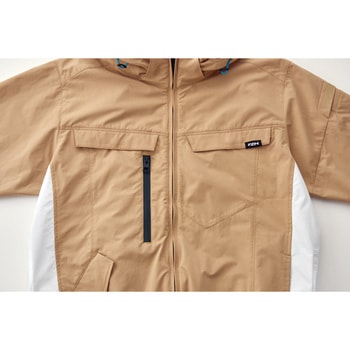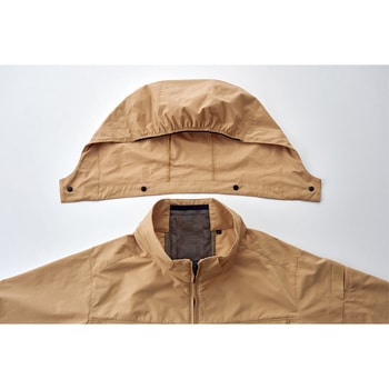 抜群の動きやすさを追求したストレッチウェア。夏場の着用でも肌にはりつきにくい素材を使用・背中ランヤード取り出し口・伸縮性や弾力性に優れた素材で動きやすく快適な着心地・運転席の背もたれに干渉することなく、外気が取り込める脇部分ファン取付・ウェア内のケーブルをスッキリまとめることができる・ヘルメットの上から被れる大型フードは取り外しが可能・スマートフォンなどの収納に便利なファスナーポケットは収納力たっぷり