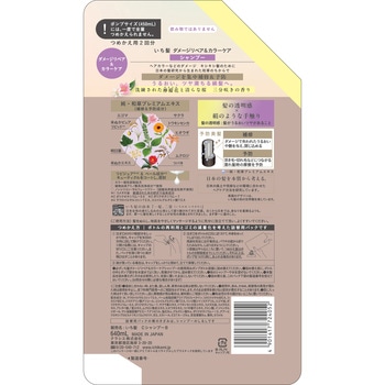 成分水、ラウロイルサルコシンTEA、パーム核脂肪酸アミドプロピルベタイン、コカミドメチルMEA、コカミドMEA、ジステアリン酸グリコール、ココイルグルタミン酸TEA、リンゴ酸ジイソステアリル、エゴマ油、ポリクオタニウム-64、ポリクオタニウム-7、サクラ葉エキス、トウキンセンカ花エキス、コメヌカ油、コメヌカエキス、アシタバ葉/茎エキス、ムクロジ果皮エキス、ヒオウギエキス、ツバキ種子エキス、クエン酸、イソペンチルジオール、ヤシ油脂肪酸PEG-7グリセリル、塩化Na、グルタミン酸Na、ポリクオタニウム-10、グアーヒドロキシプロピルトリモニウムクロリド、BG、エタノール、EDTA-2Na、安息香酸Na、香料、カラメル
