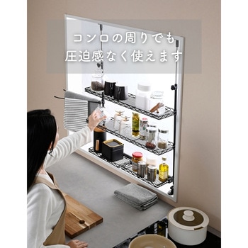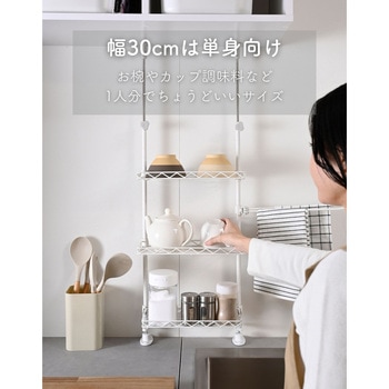 設置場所が柔軟な、突っ張り固定式キッチンラックスチールラックタイプの棚板が3枚付属使わない時はたたんでスペースを広く使える跳ね上げシェルフも1枚付属全段、こぼれ止め仕様(約1.5cm)棚板は「カチオン電着塗装」の下処理がされ、水に強い加工2.5cm間隔で棚位置は調整可能左右付け替え可能なタオルハンガー、高さも調節可能
