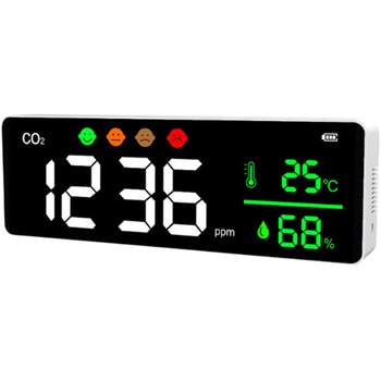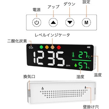 二酸化炭素濃度(ppm)、温度、湿度をリアルタイムで測定・表示。室内環境管理の目安確認に適しています。