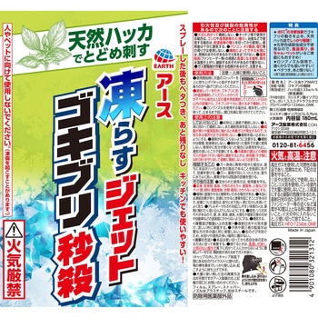 付属品無成分【有効成分】ハッカ油3.33w/v%(原液濃度)【その他の成分】ミリスチン酸イソプロピル、(E)-1,3,3,3-テトラフルオロプロペン(HFO-1234ze)、DME使用方法●使用開始時に天面のストッパーを上に持ち上げパキッと音がするまで後ろの方へ曲げて折りとってください。●噴射レバーを引き、ゴキブリに約3秒直接噴射してください。かかり方が不十分な場合は上記の量を再度噴射してください。※50cm以内の距離から、ゴキブリが十分に濡れるまで噴射してください。●ロングノズルを使用する場合は、根本をしっかり持って、止まるまで回し、噴口先端に取り付けてください。※人やペットに向けて使用しないでください。(凍傷を起こすことがあります。)※火気厳禁効能ゴキブリの駆除医薬品医療機器等法防除用医薬部外品内容量1個(180mL)