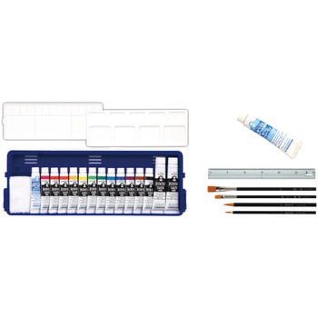 11mlチューブ各1本+ホワイト20mlチューブ2本、黒軸デザイン筆(ナイロン)4本[面相・彩色・平筆・平筆2号]、Wパレット付PPケース、アクリル製溝付定規[30cm]、パレットクリーナー11ml、ミニタオル付