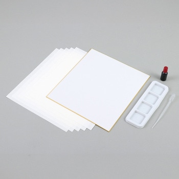水墨画用墨液 10ml×1、水墨画用紙 梅(242×273mm)×5、簡易パレット 200×50×10mm×1、スポイト×1、水墨画個人セット技法集A4サイズ×1、画仙紙・松・ドーサ引×1