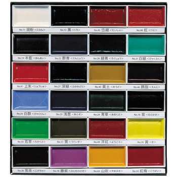 日本の伝統色を揃えた、水に溶けやすく鮮やかに発色する水彩絵具の24色セットです。