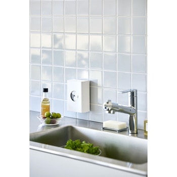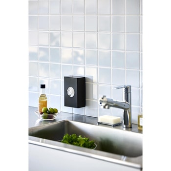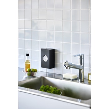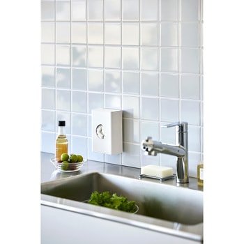 水切りネットをサッと取り出せる便利なホルダーフィルムフックでキッチンパネルやタイルに簡単に取り付けられるホルダーです。よく使う水切りネットを、中央の丸窓からサッと取り出せます。壁面に取り付けたまま蓋を開けるだけで簡単に補充できるのも便利。カットスポンジやポリ袋などの収納にもおすすめです。