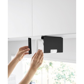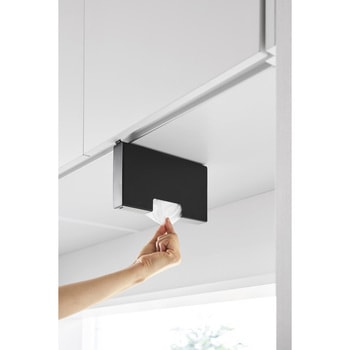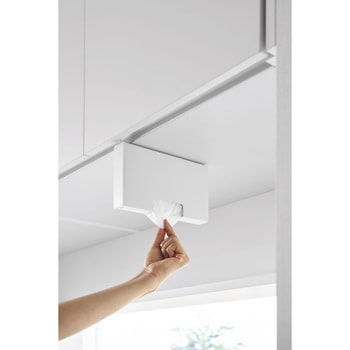 下からサッと取り出せるポリ袋収納ホルダーSサイズです。吊り下げ戸棚に差し込むだけで簡単に設置でき、蓋を開けて入れるだけで補充もスムーズ。付属の仕切り板に巻きつけることで、ポリ袋をスムーズ取り出せます。