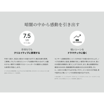 高感度性能に優れたフルサイズ/FXフォーマットの裏面照射型CMOSセンサーを搭載。さらに、強力なVR性能、暗い状況でピントが合いやすい信頼性の高いAF性能を実現。暗いシーンでもシャープで美しい描写が得られます。手ブレ補正機構(VR)は、中央7.5段・周辺6.0段の強力な補正効果を発揮。暗いシーンでも手持ちでより低速のシャッタースピードを使った創造的な表現も可能になり、表現の幅が広がります。