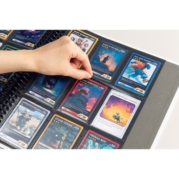 フタをカードに被せる、落ちにくいポケット形状の両面タイプのカード用ポケットです。黒台紙の高透明タイプで、カードを両面に入れられます。