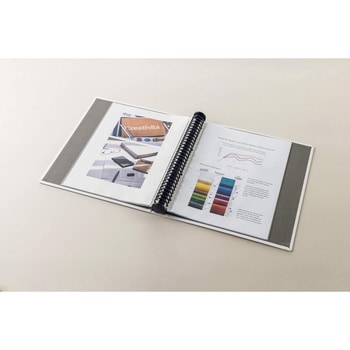 丈夫な貼り表紙で、A4判のクリアーポケットが入る寸法のバインダーです。とじ具は、ABS樹脂製のロック式リングとじ具で、不用意にとじ具が開かないように設計されており、上下のレバーを外側に倒すことでとじ具が開きます。
