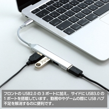 複数のUSB機器を同時に使用できる4ポートUSBハブです。ロントのUSB2.0の3ポートに加え、サイドにUSB3.0の1ポートを搭載しています。デバイスに差し込むだけで使えるため、パソコン作業やゲーム時のUSB不足を手軽に解消できます。軽量で持ち運びやすく、職場や自宅など幅広いシーンで活躍します。