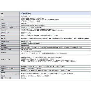仕様●カメラ/マイク:顔認証対応カメラ、有効画素数:最大1920×1080ピクセル(約207万画素)、アレイマイク搭載●サウンド機能:PCM音源(24ビットステレオ)●セキュリティチップ:TPM(TCG V2.0準拠)●バッテリー駆動時間:(JEITA3.0)約9.0時間(動画再生時)、約18.1時間(アイドル時)[付属バッテリーパック(L)装着時]●ビデオメモリー:メインメモリーと共用●ワイヤレスWAN:搭載されていません付属品ACアダプター、バッテリーパック(L)、取扱説明書質量(g)パソコン本体:約1099、ACアダプター:約220(電源コード(約60g)除く)使用温度範囲(℃)5~35消費電力(W)エネルギー消費効率:最大約65 (社)電子情報技術産業協会 情報処理機器 高調波電流抑制対策実行計画書に基づく定格入力電力値:39電源(ACアダプター)入力:AC100V~240V、50Hz/60Hz、出力:DC16V、4.06A、電源コードは100V専用、ACアダプター、(USBPowerDelivery対応)表示方式14.0型(3:2)QHD TFTカラー液晶(2160×1440ドット)アンチグレア、外部ディスプレイ表示:アナログRGB 最大1920×1200:約1677万色、HDMI出力/USB3.1 Type-Cポート、最大4096×2160(30Hz/60Hz/120Hz/144Hz)、本体+外部ディスプレイ同時表示:アナログRGB 最大1920×1200:約1677万色、HDMI出力/USB3.1 Type-Cポート、最大2160×1440:1677万色センサー照度(明るさ)外形寸法(幅W×奥行D×高さH)(mm)約308.6×235.3×18.2(突起部除く)インターフェースUSB3.1 Type-C(R)ポート×2(Thunderbolt(TM)4対応、USB Power Delivery対応)、HDMI(R)出力端子(4K144Hz出力対応)外部ディスプレイコネクター(アナログRGBミニD-sub15ピン)、マイク入力+オーディオ出力(ヘッドセットミニジャック3.5mm(M3)、CTA準拠)バッテリーリチウムイオンメモリーメイン:16GB LPDDR5X SDRAM(拡張スロットなし)バッテリー電圧(V)11.55使用CPUインテル(R) Core(TM) Ultra 5 プロセッサー 135U、P-core:最大ターボ周波数4.40GHz、E-core:最大ターボ周波数3.60GHz、コア数:12コア/キャッシュ:12MB充電時間(時間)最大3(電源オフ時)、最大3(電源オン時)バッテリー容量(mAh)4786OSWindows 11 ProチップセットCPUに内蔵グラフィックアクセラレーターインテル(R)グラフィックス(CPUに内蔵)キーボードOADG準拠キーボード(87キー)、キーピッチ:19mm(縦・横)一部キーを除く)ポインティングデバイス高精度タッチパッド対応ホイールパッドBluetoothBluetooth v5.3ストレージSSD:512GB(PCIe)、TCG Opal v2.0準拠のSSDを採用しています、上記容量のうち約15GBをリカバリー領域、約1GBをシステム領域として使用(ユーザー使用不可)使用湿度範囲(%RH)30~80(結露なきこと)無線LANWi-Fi 6E対応、IEEE802.11a/b/g/n/ac/ax(6GHz帯含む)準拠(5GHzチャンネル帯:W52/W53/W56 )、WPA3、WPA2-AES/TKIP対応カードスロットSDメモリーカードスロット×1(SDHCメモリーカード/SDXCメモリーカード対応/著作権保護技術対応/UHS-I・UHS-II高速転送対応)LAN1000BASE-T/100BASE-TX/10BASE-T内容量1台