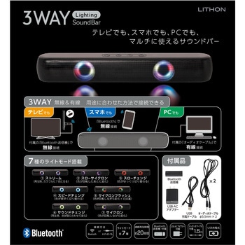 その他【検索デバイス名】LITHON SB-010セット内容Bluetooth送信機、USB充電ケーブル、オーディオケーブル Φ3.5mm × 2、USB-ACアダプター型式2chスピーカー デュアルパッシブラジエーター型質量(g)【Bluetooth送信機】10使用温度範囲(℃)5~35電源USB電源最大出力(W)5×2口径(Φmm)【スピーカー】50本体質量(g)135接続3.5mmイヤホンジャック入出力周波数2.4GHz帯(2.402GHz~2.480GHz)インピーダンス3ΩバッテリーDC3.7V リチウムイオン電池 1800mAh充電時間5時間 ※充電機器により異なることがあります対応メディアmicroSDカード、microSDHCカード( ~32GB)寸法(幅W×奥行D×高さH)(cm)【スピーカー本体】43×6.5×6.5【付属 Bluetooth 送信機】2.3×1.2×6.1連続再生時間20時間(ライトオフ時)※使用条件により異なることがあります対応フォーマットMP3接続台数【同時】1台伝送距離(m)最大10 ※使用状況・環境条件により異なることがあります+Bluetooth【Bluetooth送信機】Bluetooth標準規格 Ver.5.1、 class2【スピーカー】Bluetooth標準規格 Ver.5.3、class2対応プロファイルA2DP、AVRCP、HFP内容量1個