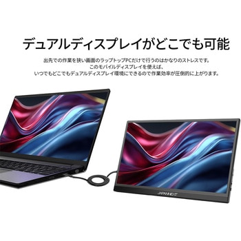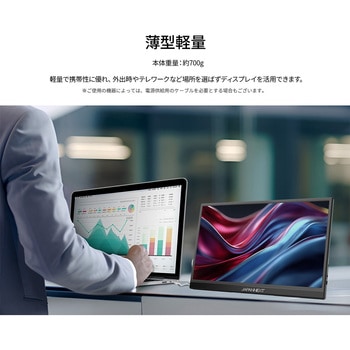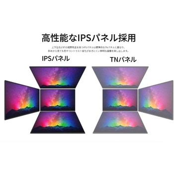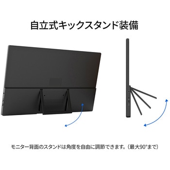 15.6インチのIPSパネルを搭載し、フルHD(1920×1080)解像度に対応したモバイルモニターです。あらゆる角度から見ても色やコントラストの変化がおきにくいIPSパネルを搭載し、広視野角上下左右178°を実現します。約700gの軽量設計と最薄部14mmの薄型本体は、優れた携帯性を備えています。さまざまな環境でも、手軽にマルチディスプレイ環境を構築可能です。モニター背面にキックスタンドを搭載しているので自立して使用することができ、どこでもデュアルディスプレイ環境の構築が可能です。また、携帯時に便利なフェルトケースを同梱。製品本体をホコリや傷から守り、持ち運びに最適です。入力端子としてハイブリッド対応(モニターへの電源と映像を1本で送信)のUSB-Cを1つとminiHDMIを1つ装備します。※miniHDMI使用時にはUSB-C端子からの電源供給が必要になります。75×75mmのVESAマウントに対応し、モニターアームなどに取り付けて使用することも可能です。モニター画面のフリッカー(ちらつき)、およびブルーライト(青色光)を軽減、目の負担を軽くします。2W×2のスピーカーを内蔵していますので、動画やゲームなどをお楽しみいただけます。本製品には、2年間のメーカー保証が付きます。