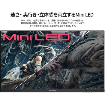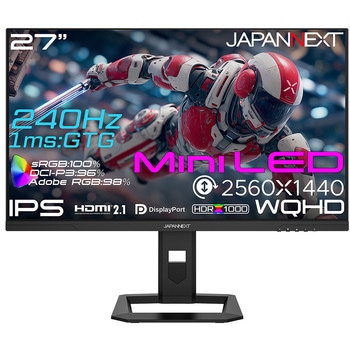 27インチのIPSパネルを搭載し、Mini LEDバックライトを採用したWQHD(2560×1440)解像度のゲーミングモニターです。Mini LEDバックライトとローカルディミング(エリア別バックライト制御)により、黒つぶれや白浮きを抑えたリアルな映像を実現します。SDR表示時450cd/m2、HDR表示時のピーク輝度1000cd/m2に対応し、APL15%時(画面の一部が明るいシーン)でも最大1500cd/m2を実現。HDR1000相当の性能を備えています。sRGB 100%、DCI-P3 96%、Adobe RGB 98%の広色域に対応。HDR(ハイダイナミックレンジ)対応で明るい部分も暗い部分もくっきり表現。240Hzの高速リフレッシュレート、1ms(GTG:OD時)の高速応答速度に対応。また、可変リフレッシュレート(VRR)にも対応。スタンドは高さ調整(最大120mmの範囲)、ピボット(回転)、スイーベル(首振り)機能対応。入力端子はHDMI 2.1x2、DP 1.4を装備。複数の入力映像を同時に表示するPIP(Picture In Picture)とPBP(Picture By Picture)に対応、PIPではもう一つの入力画面を子画面で同時表示が可能。PBPでは2つの入力を左右に同時表示することが可能。100×100mmのVESAマウント対応。スピーカーは内蔵しておりません。本製品には、2年間のメーカー保証が付きます。