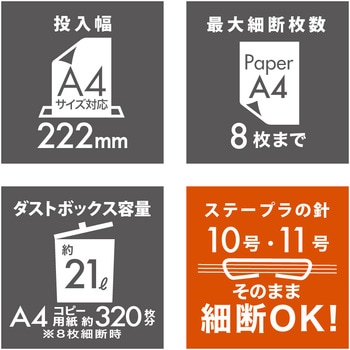 用途静音・マイクロカット・CD裁断対応のシンプルシュレッダ。付属品分別ケース幅(mm)投入:紙/222、CD/124色ホワイト定格電圧(V)AC100(50/60Hz)定格消費電力(W)260(50/60Hz)本体質量(kg)8.2寸法(幅W×奥行D×高さH)(mm)365×250×456電源コード(m)1.5定格時間(分)約10(休止時間約60分)運転音(dB)約58(無負荷時)ダストボックス容量(L)約21(A4上質紙64g/m2約320枚/8枚細断時)細断寸法(mm)約2×15最大細断枚数紙/8枚(A4上質紙64g/m2)※郵便はがき1枚(厚み0.2mmまで)、CD/1枚細断形状紙/マイクロカット、CD/4分割定格細断速度(50Hz/60Hz)(m/分)1.6待機電力(W)1.3内容量1台