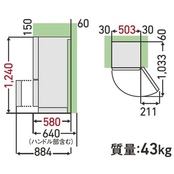 質量(kg)43定格消費電力(W)電動機 (50/60Hz):58/58、電熱装置 (50/60Hz):110/110寸法(幅W×奥行D×高さH)(mm)503×580×1240機能【霜取】自動年間消費電力量(kWh/年)269定格内容積(L)160(冷蔵室:98〈食品収納スペースの目安:73〉、冷凍室:62〈食品収納スペースの目安:38〉)必要最小設置寸法(幅W×奥行D×高さH)(mm)563×640×1390内容量1台