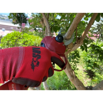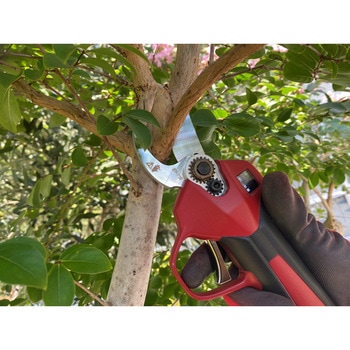 剪定作業を軽減するコードレス電動剪定鋏スゴセンライトです。初心者向けの充電式剪定鋏、25mmの枝が剪定できます。2段階の刃の開き調整が可能です。素手で使用の際は安全装置が作動します(ただし手袋装着時は作動しないので注意)。