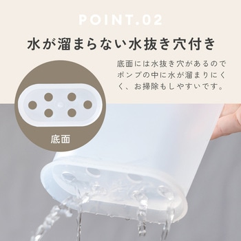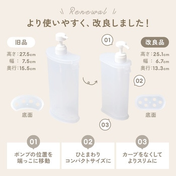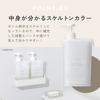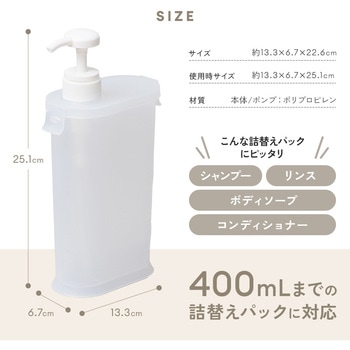 詰替えパックごとスッポリ!シャンプーなどの詰替えに便利なディスペンサーです。詰替えパックの開口位置に合わせてポンプの位置が端にあるため、詰替え作業が簡単に行えます。スリムな設計でスペースをとらず、浴室もスッキリ。底面には水抜き穴があり、水が溜まらずお手入れも簡単です。400mLまでの詰替えパックに対応。
