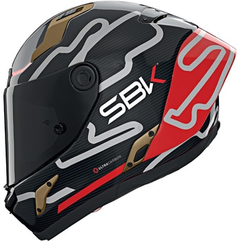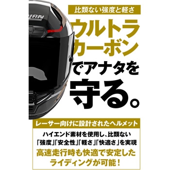 カーボンとコンポジットファイバーをシェルに採用。帽体はMFJ公認SG規格、シールドはECE規格をクリア。軽さと強度を両立させたフラッグシップモデル