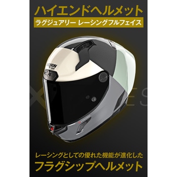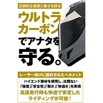 カーボンとコンポジットファイバーをシェルに採用。帽体はMFJ公認SG規格、シールドはECE規格をクリア。軽さと強度を両立させたフラッグシップモデル