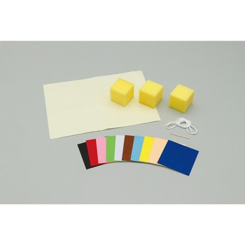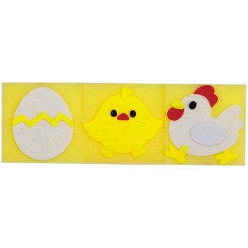 材質:ウレタン、ポリエステル、紙、ポリウレタン。サイズ:完成サイズ:約180×60×60mm、スポンジ :60×60×60mm、フェルトシールセット10色組:100×100mm、剥離紙:257×364mm、ゴムひも:3mm×1m、つまようじ:65×2×2mm。セット内容:スポンジ×3、フェルトシールセット10色組(赤・白・黒・黄緑・黄・水・茶・ピンク・青・ペールオレンジ)×1、剥離紙×1、ゴムひも×1、つもようじ×1