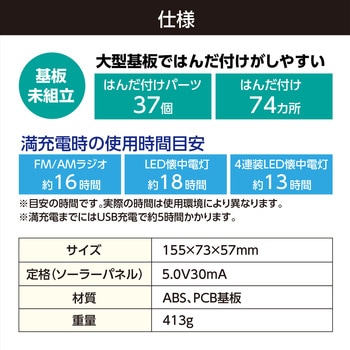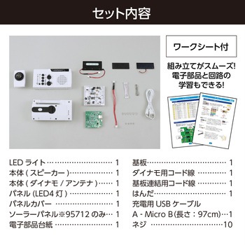 防災用のダイナモラジオライトを自分の手で組み立てられる学習向け電子工作キットです。組み立て作業を通して、発電・蓄電のしくみやラジオが動く原理を体感的に学ぶことができ、防災機器の役割や電気の流れへの理解を深めます。ダイナモ、ソーラー、USB充電といった複数の充電方式を備えており、実用的な防災用品としての仕組みも学習できます。はんだ付けや組み立てを行いながら完成させる工程は、防災学習と技術学習を兼ねた教材として活用しやすく、保育実習や授業、ワークショップでの制作にも適しています。完成後は実際に防災ラジオライトとして使用できるため、学習内容を身近な生活と結び付けて理解できます。貼る作業や組み立てを中心とした工程で、短時間でも完成しやすい構成のため、時間の限られた実習や学内制作にもおすすめです。手作りならではの体験を通して、学びと実用性を両立した防災教材として活用できます。【商品スペック】電源:リチウムイオン電池内蔵。リチウムイオン電池仕様…公称電圧:3.7V、定格容量:1800mAh、満充電時電圧:4.2V、サイクル寿命:約500回 使用時間の目安…ラジオ連続使用:約16時間、LEDライト連続使用:約18時間、テーブルランプ連続使用:約13時間(※使用状況や音量などにより、使用時間は前後します。)