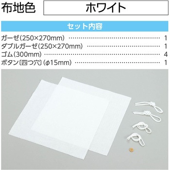 材質:ガーゼ:綿100%、ゴム:ポリエステル、ボタン:プラスチック。サイズ:完成サイズ:約230×250mm、ループ:約50mm、ガーゼ:250×270mm、ダブルガーゼ:250×2700mm、ゴム:300mm、四つ穴ボタン:約Φ15mm。セット内容:ガーゼ×1、ダブルガーゼ×1、ゴム×4、四つ穴ボタン×1