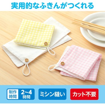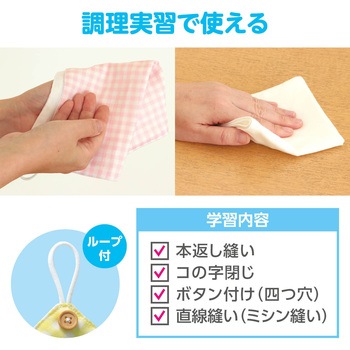調理実習などで使えるふきんを制作できる手芸キットです。制作を通して、本返し縫いや直線縫いなどの基礎的な縫製技術を学ぶことができます。カット不要で短時間で制作できるため、授業や家庭科実習にも取り入れやすく、はじめての裁縫学習におすすめのキットです。製作時間の目安は約2~3時間。【準備するもの】ミシン、縫い針、縫い糸、裁ちばさみ、まち針、定規