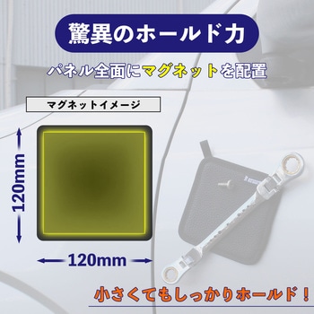 自動車整備、電気工事、建築作業、DIYなど様々な場面で活躍するマグネットツールソフトパネル。マグネット量が多く、しっかり張り付きます。ループ付属。マグネットが付かない場所でも使用でき、つまむことで取り外しも楽に行えます。ソフトパネルのため、張り付ける対象物を傷つけません。