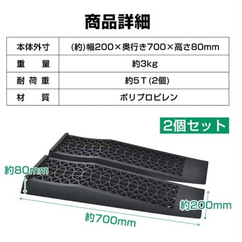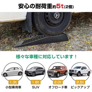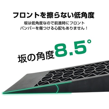 全高が低く設計されているため、ローダウン車でも無理なく差し込めるカースロープです。坂の角度が緩やかで、前進時にフロントバンパーを傷つけにくく安心。タイヤがスリップしにくい形状に加え、タイヤ止め付きのためスロープが見えにくい状況でも安全に車を進められます。2個セットでも約3kgと軽量で、持ち運びや収納も簡単です。