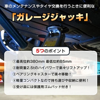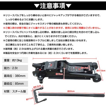 スチール製で耐久性の高い2.5tジャッキです。最低位85mm・最高位380mmまで稼働し、乗用車のジャッキアップに適したリフト範囲をカバーします。軽量ながら安定した荷重支持力を持ち、作業時の安全性にも配慮。ゴムパッドなどの付属はありませんが、基本的なメンテナンスやリフト作業を安心して行える汎用モデルです。作業工具として車載用としても活躍します。