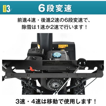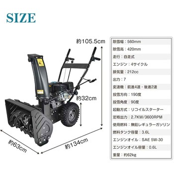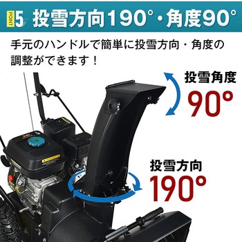 強力な7馬力の4サイクルエンジンを搭載し、パワフルな除雪と安定した走行を実現。自走式でレバーを押すだけの簡単操作、小回りも抜群です。幅広かつ高さのある除雪幅で効率よく作業でき、投雪方向は190°・角度90°まで手元で調整可能。雪道に強いブロックタイヤを採用し、スムーズに作業できます。