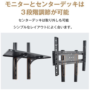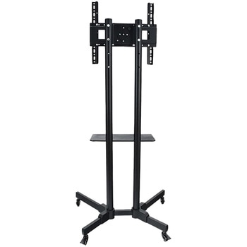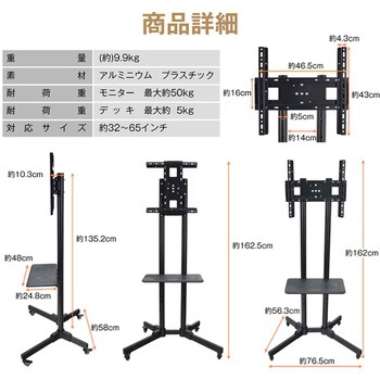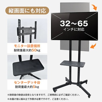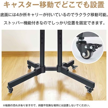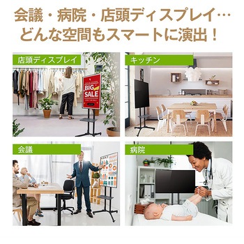 キャスター付きで移動が簡単、ストッパーでしっかり固定できるテレビスタンドです。3段階の高さ調整が可能で、縦画面にも対応しているため用途が広がります。付属のネジと工具で簡単に組み立てができ、中央部にはAV機器や雑貨を置ける便利な棚付き。会議室でのプレゼンや店頭ディスプレイなど、幅広いシーンで活躍します。