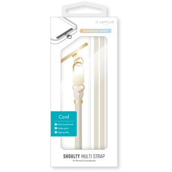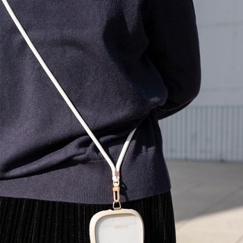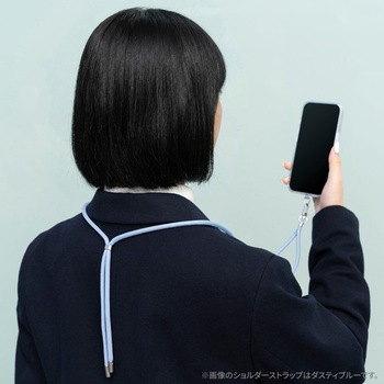 端末やケースを選ばず装着できるスマホショルダーストラップ/端末背面を邪魔しない、細身で頑丈なステンレス製挟み込みシート付属/長さ調整可能/しなやかなΦ6mmコード/高級感あるマットパーツ/こなれ感のあるカラーで大人でも使いやすい