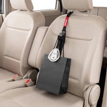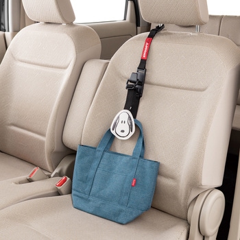 運転中の荷物の転倒防止に! スヌーピーフェイスがキュートなフックスヌーピーで車内をかわいく演出約10kgまでの荷物を支えることができますヘッドレストステーに引っ掛けるだけ。取付け簡単2種類のフックとループ部分に荷物が掛けられます様々なサイズの荷物に対応