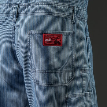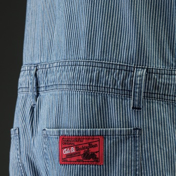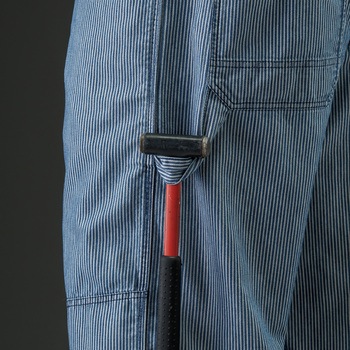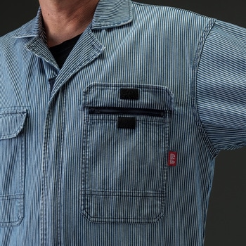 ヴィンテージテイストヒッコリーつなぎ服綿100%ヒッコリーつなぎ服で、糸から染めた本格的ヒッコリー生地を採用胸ポケットはファスナー・面ファスナー仕様右脚にはハサミやカッターナイフなどの尖った器具も収納可能なダブルツールポケットを採用金属パーツ露出ゼロ仕様