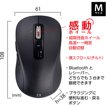 用途画面スクロール超絶快適。感動ホイールマウス。付属品取扱説明書、単3形アルカリ乾電池 2本(お試し用)、小型マイクロレシーバー(マウス 本体に収納可能W14xD19xH6mm/約2)質量(g)約85 (電池、レシーバー含まず)対応OSWindows11、10/macOS10.15以降/ChromeOS/iPadOS16以降/iOS17以降 ※ボタンの機能はOSに準じます。ボタン割当ソフト[Digio2 Mouse Setting]はWindows、macOS以外非対応。コネクタ形状USB (A)寸法(幅W×奥行D×高さH)(mm)61x108x38対応機種USB Aポートが正常に動作するパソコン、もしくはHOGP(HID Over GATT Profile)に対応したパソコン、タブレット、スマートフォン分解能1000/1600/2400/3200dpi 切替式使用電源単3形アルカリ乾電池2本(1本でも使用可能)保証期間6ヶ月電池寿命連続動作時間 約488時間、電池交換の目安 約937日(電池2本使用を想定)ボタン数5(4ボタン+ホイールボタン)+2(左右チルトボタン)通信可能距離(m)半径約6-8(使用環境により異なる)Bluetooth5.0 Class2電波周波数2.4GHz帯内容量1個