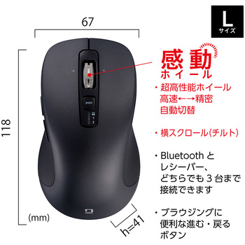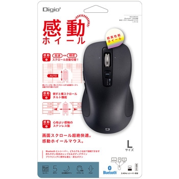 用途画面スクロール超絶快適。感動ホイールマウス。付属品取扱説明書、単3形アルカリ乾電池 2本(お試し用)、小型マイクロレシーバー(マウス 本体に収納可能W14xD19xH6mm/約2)質量(g)約98 (電池、レシーバー含まず)対応OSWindows11、10/macOS10.15以降/ChromeOS/iPadOS16以降/iOS17以降 ※ボタンの機能はOSに準じます。ボタン割当ソフト[Digio2 Mouse Setting]はWindows、macOS以外非対応。コネクタ形状USB (A)寸法(幅W×奥行D×高さH)(mm)67x118x41対応機種USB Aポートが正常に動作するパソコン、もしくはHOGP(HID Over GATT Profile)に対応したパソコン、タブレット、スマートフォン分解能1000/1600/2400/3200dpi 切替式使用電源単3形アルカリ乾電池2本(1本でも使用可能)保証期間6ヶ月電池寿命連続動作時間 約488時間、電池交換の目安 約954日(電池2本使用を想定)ボタン数5(4ボタン+ホイールボタン)+2(左右チルトボタン)通信可能距離(m)半径約6-8(使用環境により異なる)Bluetooth5.0 Class2電波周波数2.4GHz帯内容量1個