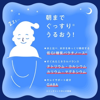 優れたミネラル※バランスで、水分・糖質補給に最適な熱帯夜サポートドリンク。低GI糖質のパラチノース(R)を使用。水分をゆっくり吸収するため、就寝前・運転前におすすめです。無果汁・香料使用。※ナトリウム・カルシウム・カリウム・マグネシウム
