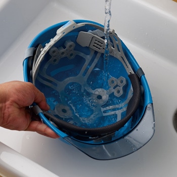 【クリアな視界】 透明ひさしを採用しているため、上向きの作業や天井の低い場所でも広い視界を確保でき、安全確認がスムーズです。