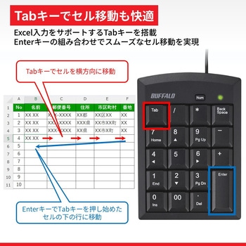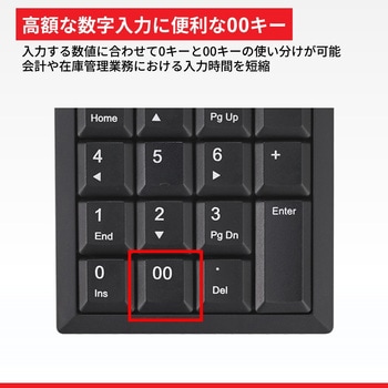 Excelで便利な「Tab」キーや高額入力に使える「00キー」を搭載。NumLock非連動機能を搭載で、煩雑なNumLock問題を解決。デスクトップパソコンと同じく、打鍵しやすいキーピッチ19mmを採用。ドライバーインストール不要の簡単接続。