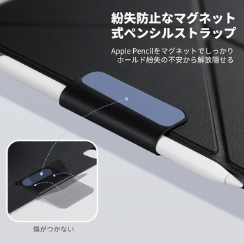 12.9インチ iPad Pro用ケースです。 横置きと縦置き両方を叶えるスタンド機能は使いやすくて便利です。 三角形の抜群安定感により倒れなく使えます。 折り紙のようにおることで角度は4つ選択でき、ネットサーフィンに動画鑑賞、勉強等の作業向けとスムーズに素早く切り替えられます。 こだわりの詰まったレザーは、きめが細かく美しい色合いが魅力です。 裏面はポリウレタンレザーで傷つきにくいし汚れも強いです。 優れたグリップ力を発揮します。 色合いと作りの良さが醸し出す落ち着いた風合いは様々な場面に馴染めます。 マグネット式でケースの張り付けが非常に行いやすいです。 iPadその物の薄さ感を感じます。 ケース自体が非常に軽量でマグネットが強力なので、ずり落ちたり剥がれたりせずiPadがしっかり固定されます。 重さ300g以下、ケースは薄くて軽くて作られております。 市販の多くのフォリオよりも軽量です。 iPadに余計な重さを増加しません。 iPadをより簡単に、より快適に持ち運ぶことができます。 隠されたマグネット式ペンシルストラップは、充電中のペンシルをしっかりと保持し、外出先での落下を防ぎます。 ストラップを使用しない時は折りたたんで背面パネルに隠すことができ、iPadフォリオのミニマルでスマートなルックスを保ちます。