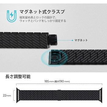 セット内容カーボンファイバー製Apple Watchバンド、0.39インチコマ×2、調整用のピン長さ(mm)185.4幅(mm)22厚さ(mm)4質量(g)32.4対応機種Apple Watch全世代材料カーボンファイバー、ステンレススチール色(柄)モダン保証期間1年間内容量1個
