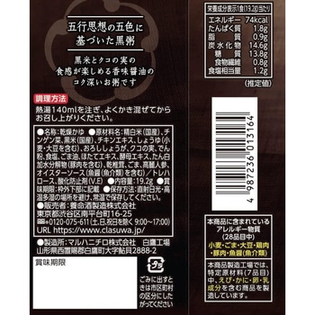 【商品の特徴】やみつきになる香味醤油が香る中華味のお粥です。あざやかなクコの実チンゲン菜が彩りを添えます。[1食当たり74kcal]【シリーズ全体の特徴】養命酒製造オリジナルレシピの健康粥です。フリーズドライで約1分のカンタン調理。お手軽ながらもつぶつぶ素材とゴロゴロ野菜の食べごたえ。時短でもおいしく食事したい方や趣味に時間を費やすアクティブシニアにおすすめ。小腹が空いたときの夜食や飲みの〆にも最適。一食当たり70~80kcal(フレーバーにより異なります)なのでカロリーコントロールにもお役立ていただけます。
