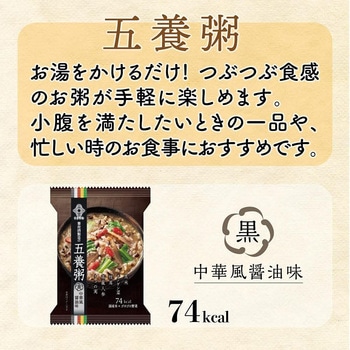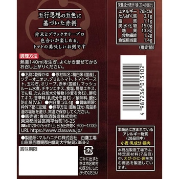 【商品の特徴】トマト味をベースに3種類のハーブが効いた南欧風のお粥です。トマトや赤米とブラックオリーブの色合いが楽しめます。[1食当たり78kcal]【シリーズ全体の特徴】養命酒製造オリジナルレシピの健康粥です。フリーズドライで約1分のカンタン調理。お手軽ながらもつぶつぶ素材とゴロゴロ野菜の食べごたえ。時短でもおいしく食事したい方や趣味に時間を費やすアクティブシニアにおすすめ。小腹が空いたときの夜食や飲みの〆にも最適。一食当たり70~80kcal(フレーバーにより異なります)なのでカロリーコントロールにもお役立ていただけます。