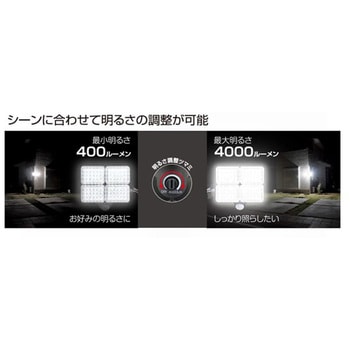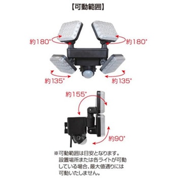 4灯のライトで照らしたいところをしっかり照射するLEDセンサーライト。400lm~最大4000lmまでシーンにあわせて明るさの調節が可能。また、4灯それぞれ可動式なので、必要な場所に照射できます。昼夜切替機能を搭載し、昼夜点灯または夜のみ点灯を選択可能です。最大探知角度180°最長探知距離12mで人の動きを検知し点灯します。