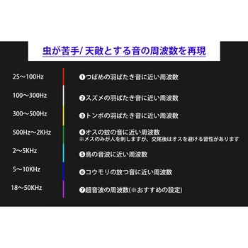 蚊や虫が嫌がる7種の音波で全方位虫よけができる虫よけバンド。充電でくり返し使え、経済的。人の耳にはほとんど聞こえず影響がなく、子どもやペットにも使用できます。蚊や虫が苦手・天敵とする音の周波数を再現し、虫を撃退するので、虫よけの薬品を使いたくない、ニオイがないものを使用したい等の希望にドンピシャ。バッテリー式で約144時間(およそ6日間)連続使用可能で、タッチ操作・防水機能もついて大変使いやすくなっています。