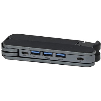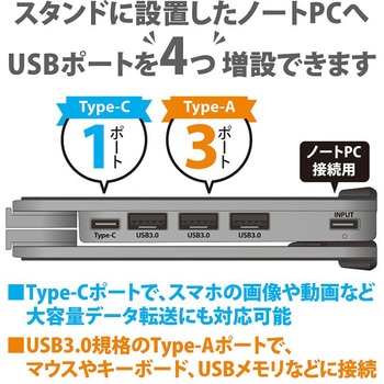 アルミ製のノートPCスタンド。収納時は鞄に入れても場所を取らないコンパクトサイズです。6段階の角度調整可能。重厚感のあるボディでノートPCをしっかりサポートします。 下方向に軽く振ると背面スタンドが出る仕様。収納袋付属。 Type-C×1、USB3.0規格Type-A×3のUSBポート付き。