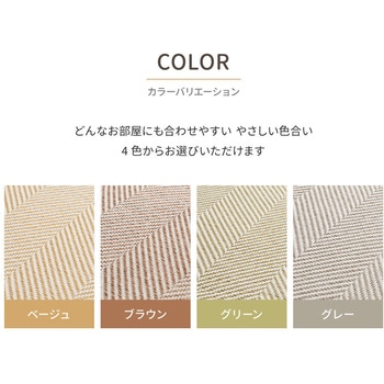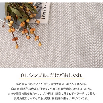 用途ざっくりとした織りで立体感があり、太めの間隔で仕上げたヘリンボン柄は、遠目で見るとボーダー柄のようにも見えるデザインに。ウレタン入りでほんのりふっくら、さらっとした肌ざわりで年中使いやすい素材感です。洗濯機で丸洗いできるから、小さなお子様やペットのいるご家庭でも安心、いつも清潔にお使いいただけます。裏面には滑り止め付き。ホットカーペット・床暖房にも対応しています。厚さ(mm)7備考洗濯可対応ホットカーペット寸法(cm)130×190機能低ホルムアルデヒド滑り止め効果あり組成表面:ポリエステル100% 中材:ウレタンフォーム5mm 裏面:不織布(滑り止め付き) タグ:合成皮革内容量1枚